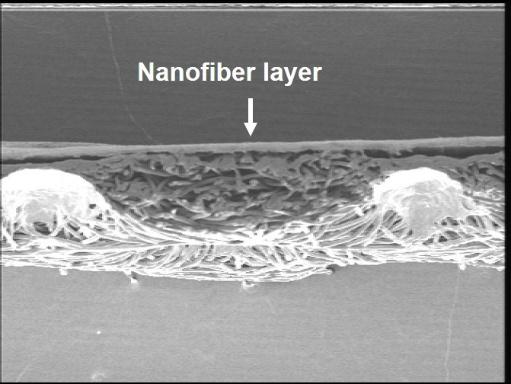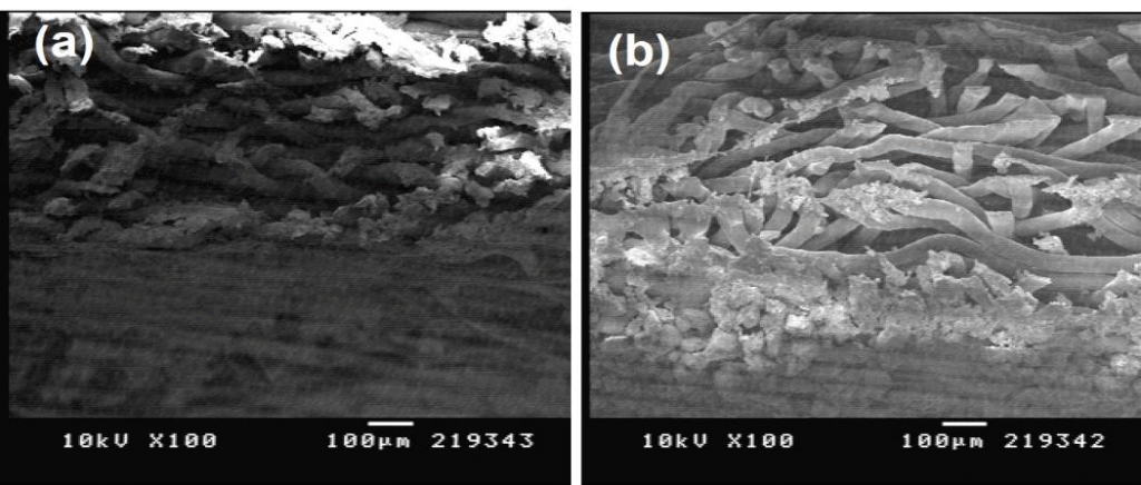 Fig 4. Cross-sectional view of used nonwoven media (a) without nanofiber (b) with nanofiber