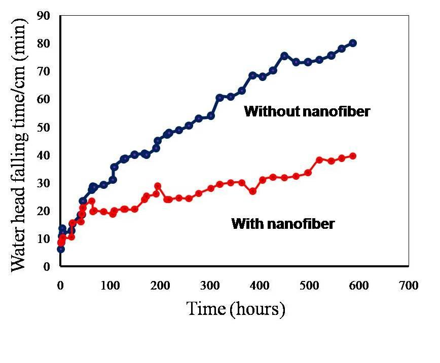 The water permeability of the existing media and nanofiber-deposited media was evaluated by a falling water head tester in the presence of soil particles. Evaluation was done by changing the soil concentration from 1 to 4% on weight of water. At 1 and 2 % soil, more water flow was observed in existing media compared to nanofiber deposited media, but the reverse of this trend was observed at 4% concentration of soil. The water flow was found to be similar for both media at 3% soil, so this concentration was taken to study the performance of nanofiber-deposited media in long-term use. In this experiment, both the media were kept continuously in the presence of soil for a long time, and the time taken for the water head to fall to 5cm was recorded continuously. The plot of water head fall time per centimeter corresponding to duration is given in Fig. 3. Initially, the time taken by water head to fall 1 cm was less in existing nonwoven media compared to nanofiber media, but after some hours, it increased and crossed the time taken through the nanofiber deposited media. This was because of the low filtration resistance of existing non-woven media, which was increasing after some hours by the intrusion of fine soil particles and clogging of pores. This phenomenon was not observed in the case of nanofiber-deposited media.