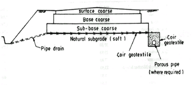 Woven mesh mats as well as non-woven, stitched coir blankets are used for this purpose, especially when the CBR value of subgrade soil is less than or equal to 4. Reported Laboratory studies by various agencies have shown that non-woven geotextile is superior to woven in such applications. Woven geotextiles of 700 to 1000 g/m2 or non-woven stitched coir blanket of 500 g/m2 are ideal for such applications. Geotextiles will be laid over the subgrade level, before the subbase level.