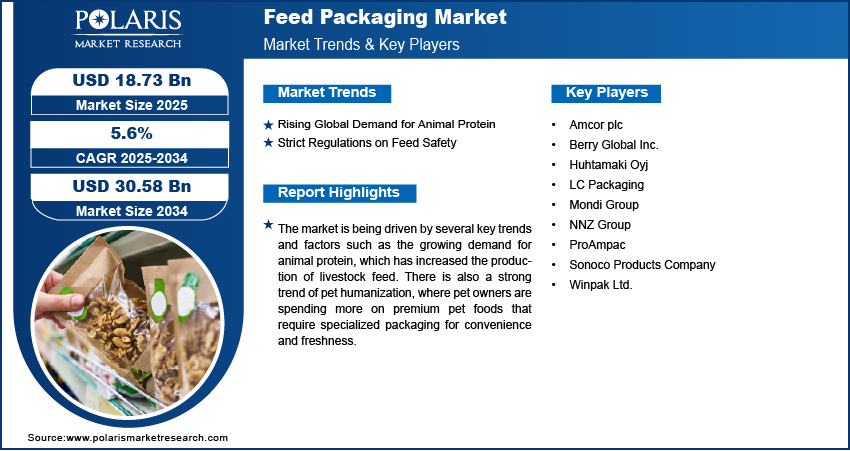 According to Polaris Market Research, the global feed packaging market size was valued at USD 17.78 billion in 2024 and is expected to register a CAGR of 5.6% from 2025 to 2034. Here are some of the major drivers: