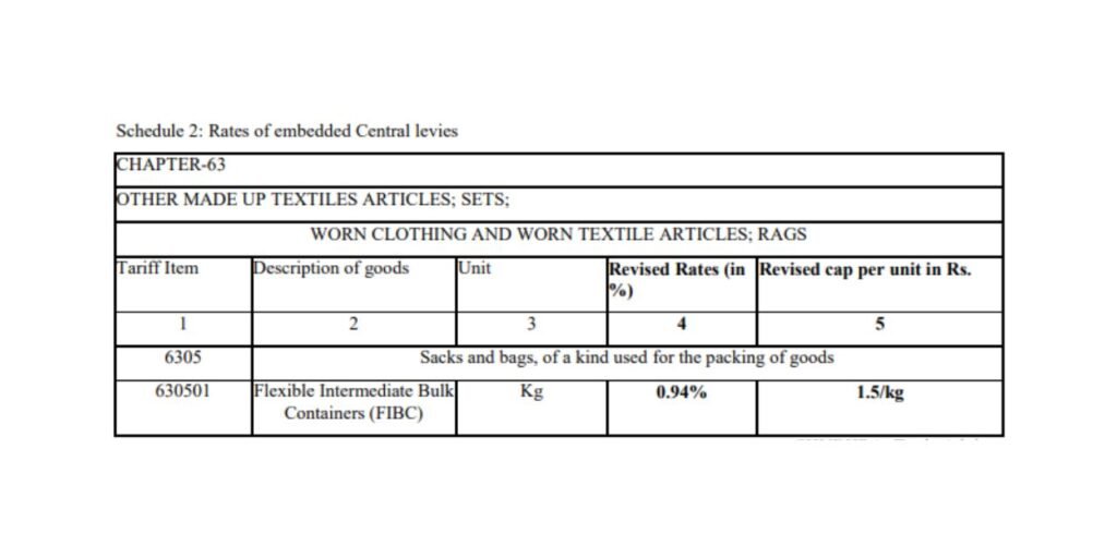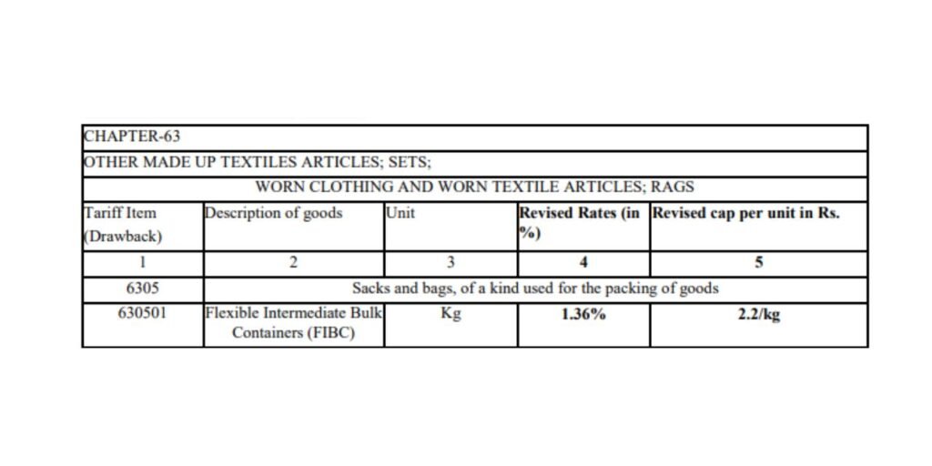 Intermediate Bulk Containers (FIBC) under RoSCTL from ‘NIL’ to 2.3% subject to a cap of Rs 3.7 per Kg.
