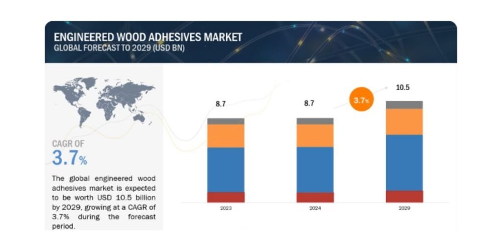 Market for Engineered Wood Adhesives expected to reach $10.5 billion by 2029 growing at a 3.7% CAGR.