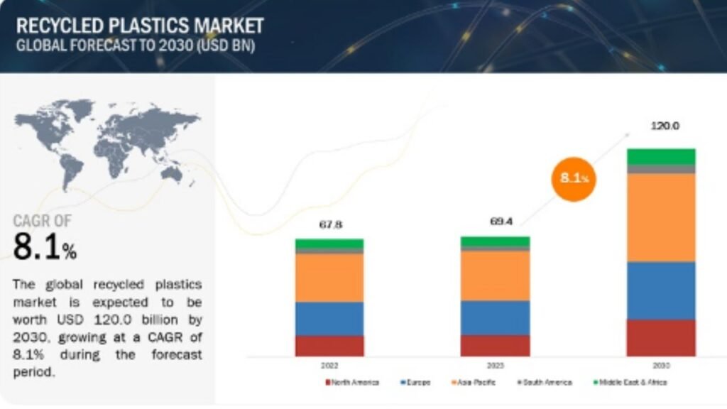 The report Recycled Plastics Market by Source (Bottles, Fibers, Films, Foams), Process, Plastic Type (PET, PE, PP, PVC, PS), Type, End-Use (Packaging, Textiles, Building & Construction, Automotive, Electrical & Electronics), and Region – Global Forecast to 2030″, is projected to grow from USD 69.4 billion in 2023 to USD 120.0  billion by 2030, at a CAGR of 8.1% from 2023 to 2030. The growing demand for usage of recovered plastics to control the rising plastic pollution levels has spurred the consumption of recycled plastics. Since recycled plastics conserve more of expended energy than virgin plastics, these are employed in most of the major end-use industries including packaging, textiles, building & construction, automotive, and electrical & electronics.