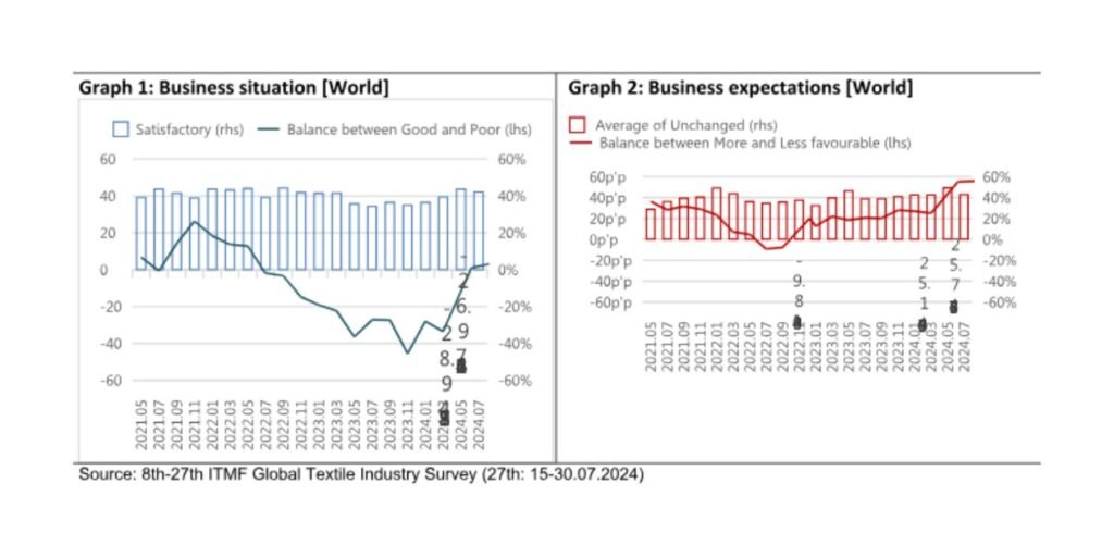 According to the ITMF’s July 2024 Global Textile Industry Survey (GTIS), the global textile value chain continues to face significant commercial challenges. Despite a challenging economic environment and limited order intake, company projections for the next six months remain optimistic. Maintain an optimistic attitude. This highly mixed picture demonstrates that firms expect this. A sluggish business cycle that has lasted for an extraordinary length of time must finally terminate.