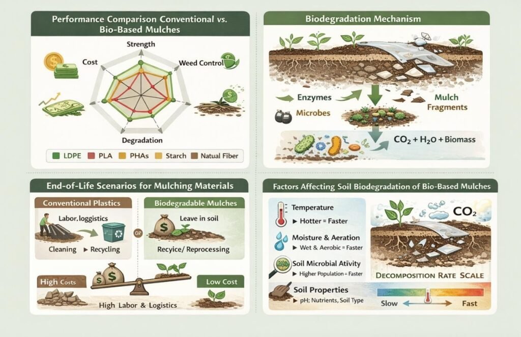 Figure 1: Comparative performance of conventional and bio-based mulches, their soil biodegradation mechanisms, end-of-life management pathways, and key environmental factors influencing degradation.