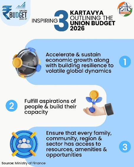 The Budget outlines three key Kartavyas: accelerating and sustaining economic growth; fulfilling people’s aspirations; and building capacities while ensuring equitable access to resources and opportunities.